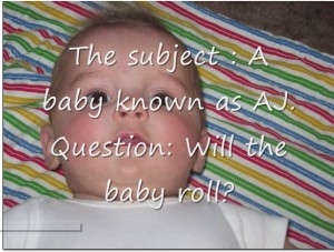 Do the AJ Roll! Posted on June 7, 2008 by admin “A video of baby AJ Rolling < %media(babyroll2.wmv|click here WMV)%> ”