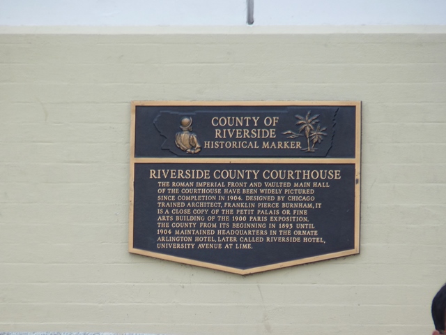 On May 2, 1893 Riverside County was created from parts of San Bernardino County and San Diego County. It was during this vote that the people chose Riverside as the county seat. It was in the year 1900 the county leaders found their inspiration for the county courthouse by visiting the Universal Fair in Paris, France. Emulating the Petite Palais, a unique structure was formed and finished in 1903 by a Chicago designer named Franklin Pierce Burnham.*