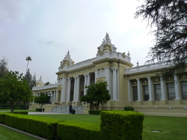 When I was a student studying law I had a class with Judge Victor Miceli. He was a long time judge (they named the law library after him) in Riverside and he told me a lot about the Riverside Courthouse. One interesting fact he told me was even though the earthquake almost destroyed the building it also uncovered some beautiful stained glass inside the courthouse. The other was that the courthouse was a city and county landmark but not a state or national landmark. The reason why is because had they designated it a national landmark, they would not have been able to retrofit the building for electronics and they wanted to be able to modify the interior to better display evidence.