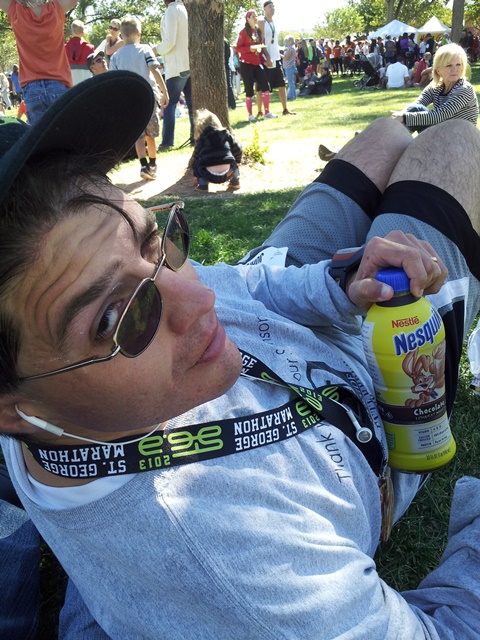 The end of the race was fun. Once the pace group passed me, not many people were running close to me. According to I passed quite a few people. It was kind of sad to see so many people so close to the finish walking, but at least they were still moving. I particularly liked that at the finish line in addition to getting my medal they were giving the runners all the ice cream they could eat (I had two drumsticks, thank you Blue Bunny). I also really enjoyed that Denise was there with a big chocolate milk. I don’t know why it works, but almost immediately after a long run it helps bring down the swelling.
