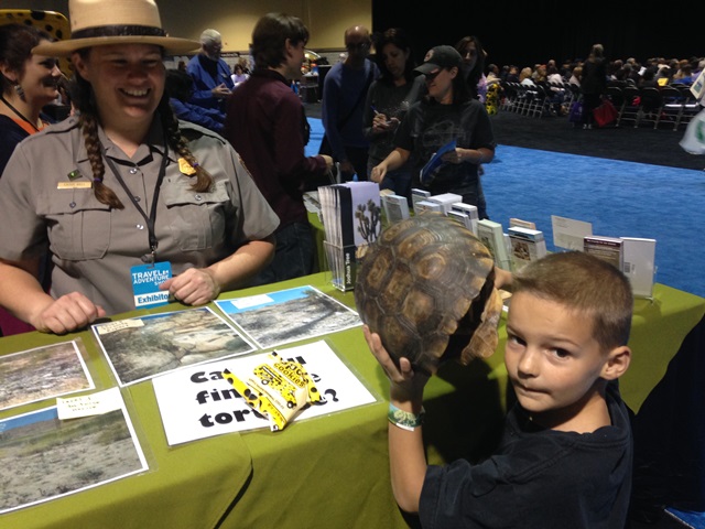 Most of our day was spent visiting different booths. I enjoyed talking to people about their different areas of expertise. For AJ it was fun because a lot of the booths had little games you could play. At one you had to find the key that opened the hotel room, at another you looked at turtle shell and guess how old it was, AJ’s favorite game was from the city of Big Bear where they gave you a balloon with a name on it and you had to find someone else with the same balloon. AJ ran around the whole convention center looking for balloons saying “what kind of balloon are you?” Unfortunately he never found a match, but he enjoyed his balloon.