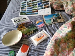 One of the benefits of the travel show is we got a lot of freebies. In addition to the balloon we got lots of stuff. From Japan I got a souvenir ice cream dish. My sister got a mixing cup. We got stickers, calendars, band aids, and snacks from different countries.