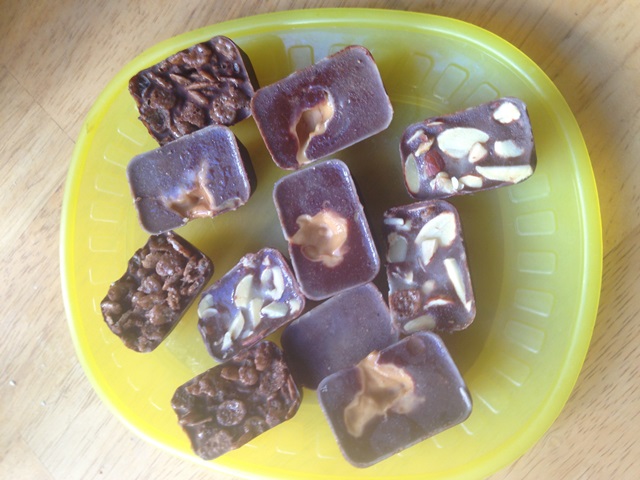 For molds I used the lids from plastic sandwich containers and ice cube trays. I liked the ice cube trays the best. It takes about 2 hrs. for the chocolate to properly harden.