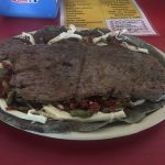 This is a Tlayuda. It is about the size of a steering wheel and has a green corn tortilla, salsa, chorizo, cheese, and flat steak.