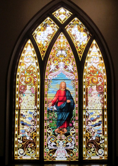 The highlight to the building has got to be the stain glass rendition of Jesus Christ in their chapel. The windows were made in Chicago by the Sebiling Wells Glass Company. Using the setting of a inspiring teacher, it depicts Jesus Christ walking in a field of flowers with his hand outstretched. My interpretation is he is kind of inviting people to hear his words (but I would say art is always subject to interpretation).